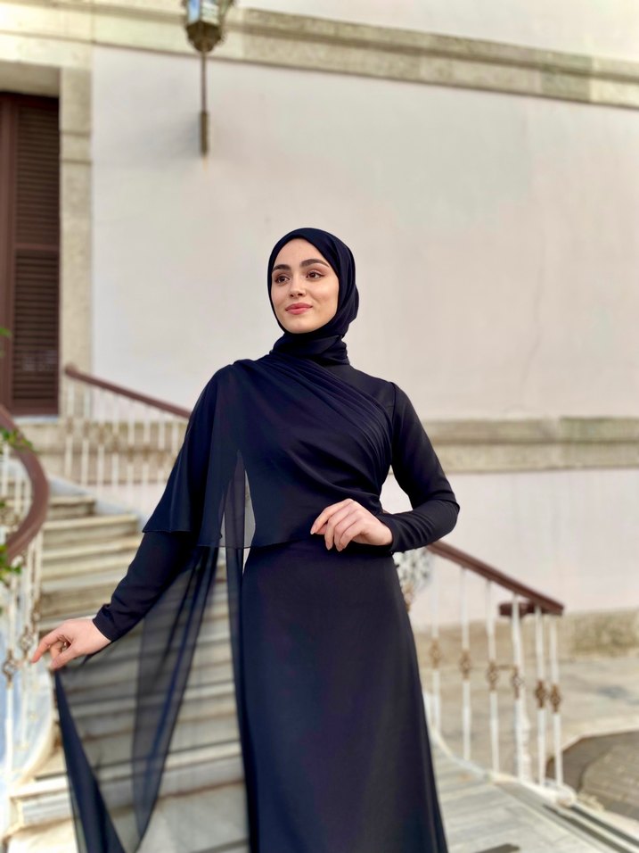 Yüksek yakalı, uzun kollu ve drapeli siyah gece elbisesi. Düzenli kesim ve uzun boy ile minimalist, mütevazı gotik stil sunar. Günlük kullanıma uygun. 34-36 beden uyumlu
