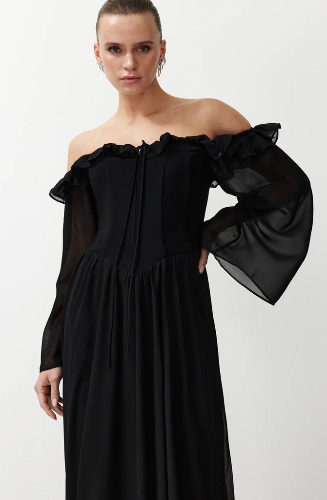 Siyah, kayık yaka ve fırfır detaylı uzun elbise. İpek gibi kumaştan, uzun kollu ve bol kesim elbise .