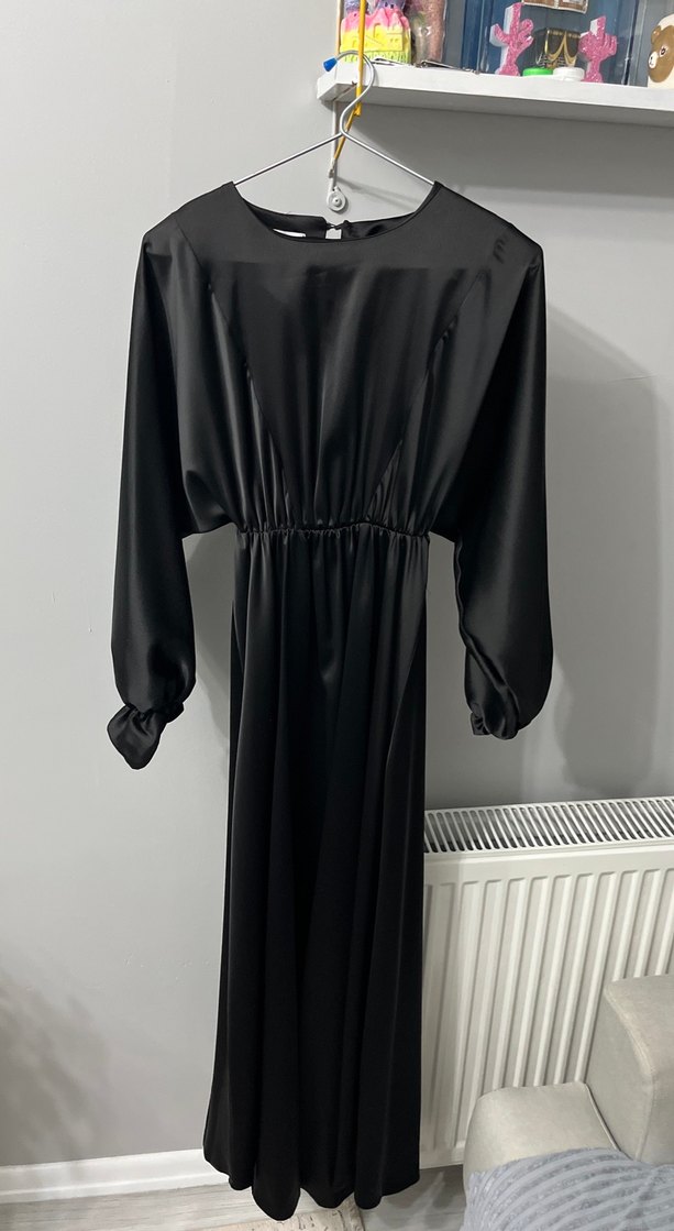 Siyah uzun kollu, bol kesim ve yuvarlak yaka uzun elbise. saten beden 38 abiye