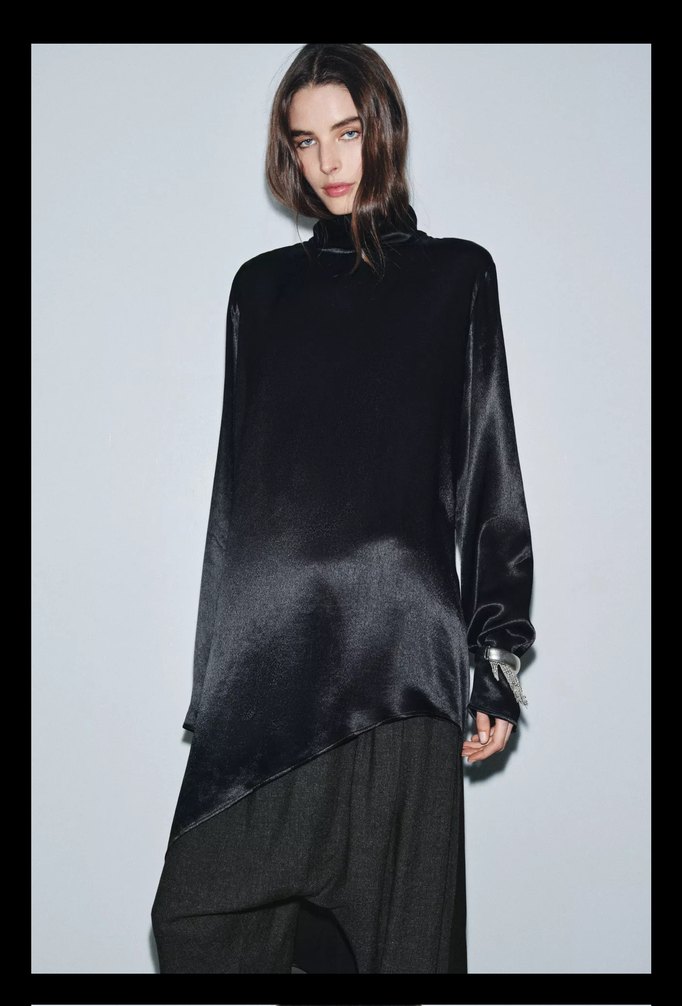 Siyah, uzun kollu kadın tunik, yüksek yaka ve bol kesimle drapeli bir siluete sahiptir. İpeksi kumaştan yapılmış, avant-garde tarzda günlük kullanım için uygundur.