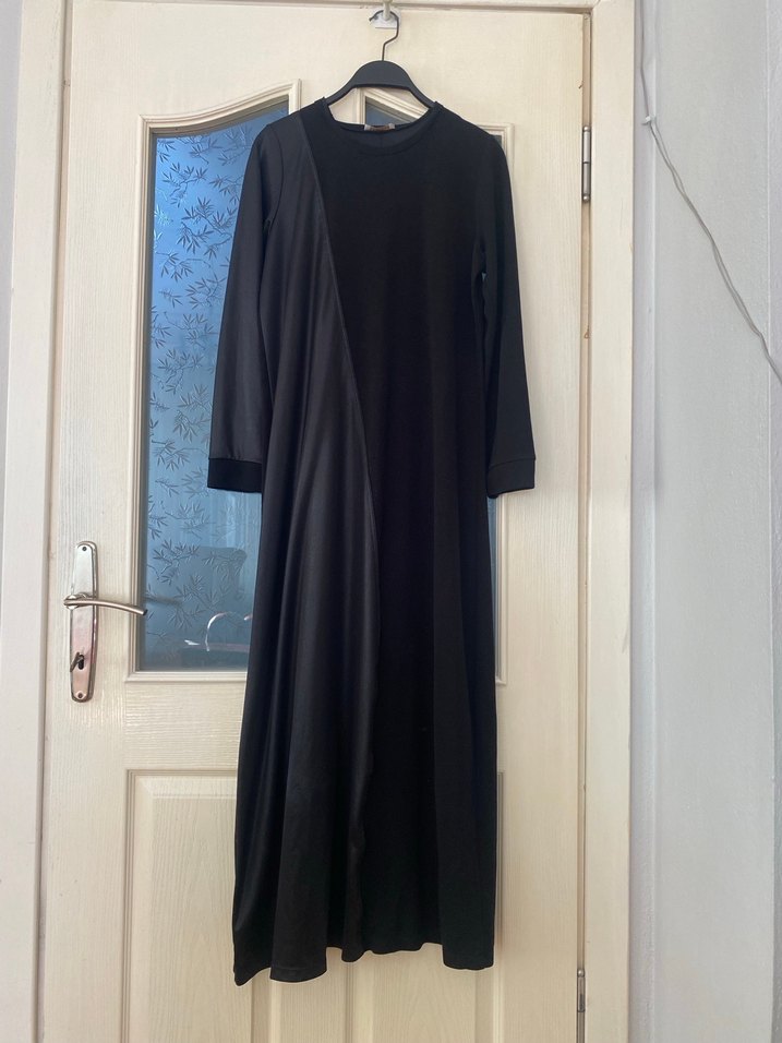 Uzun kollu, yüksek yakalı siyah uzun elbise, bol kesim ve drapeli tasarıma sahiptir. Yumuşak sentetik kumaştan yapılmıştır ve mütevazı gotik stile uygundur.Kemerli