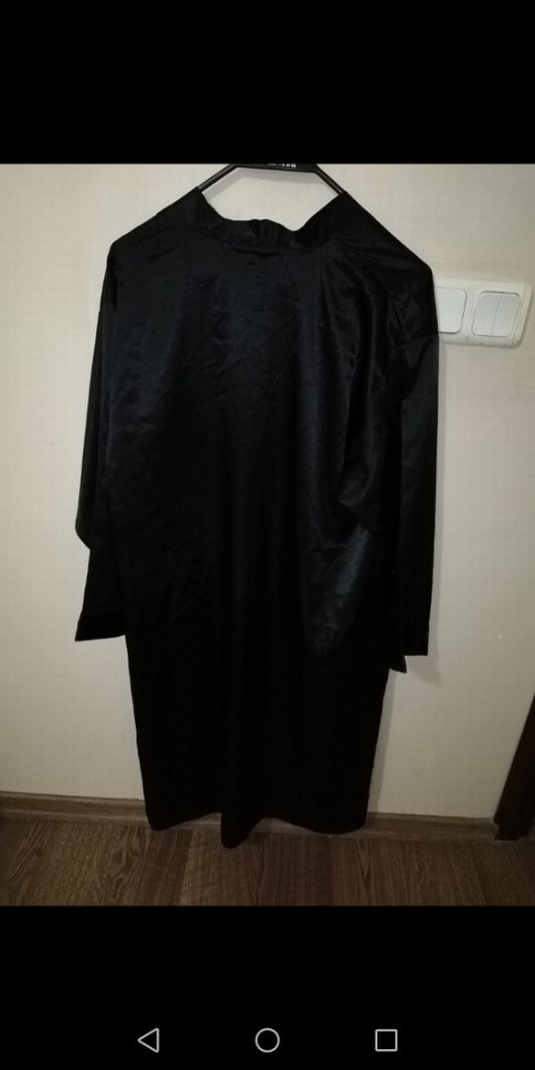 Uzun kollu, bol kesim, düz siyah renkte kadın giyimi. Gotik tarzına uygun, rahat ve uzun boyda. Sabahlık