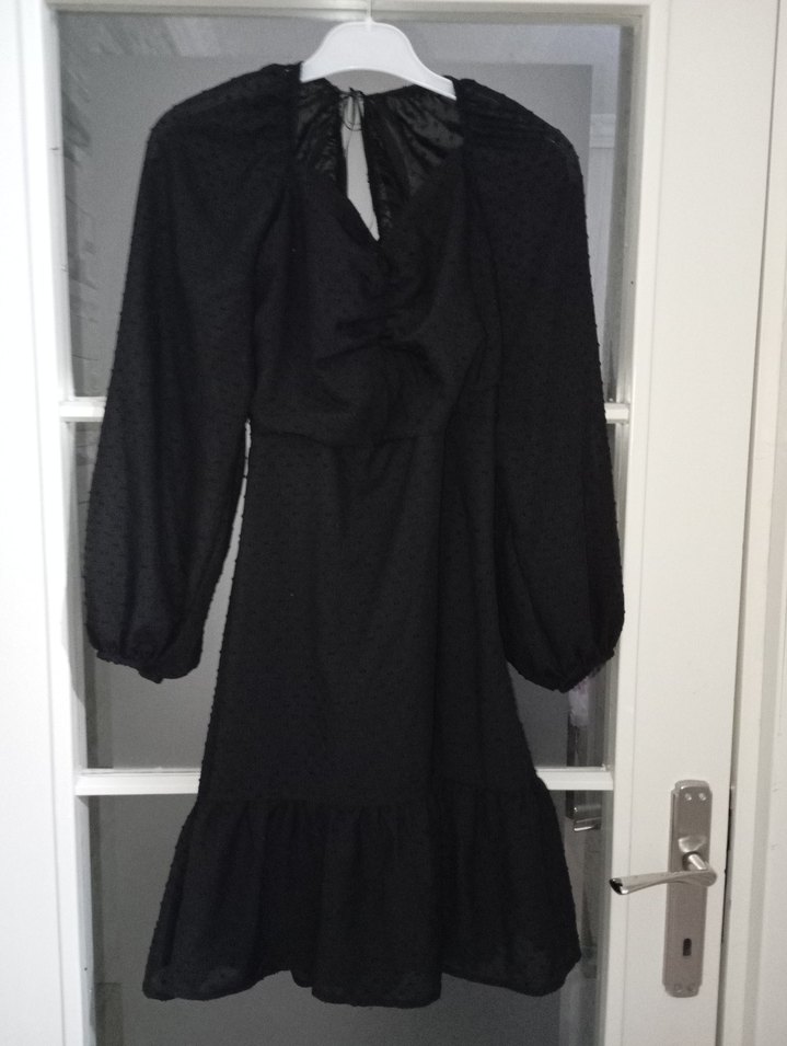 Siyah, keten kumaştan, V yaka ve fırfır detaylı, uzun kollu, bol kesim uzun elbise. Gotik tarzda romantik akşamlar için uygun.
