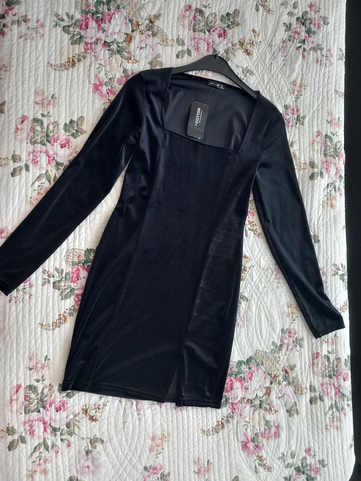 Siyah, uzun kollu ve drapeli V yakalı, gotik tarzda, vücuda oturan mini elbisedir. Romantik akşamlar için uygundur.