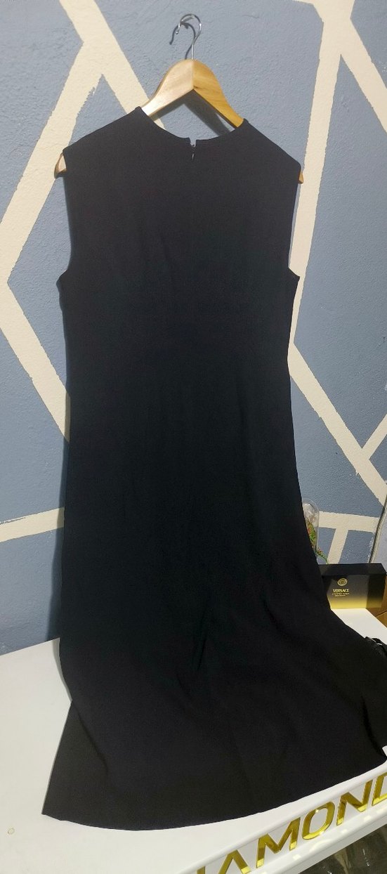 Siyah, uzun ve kolsuz hamile tunik, V yakalı ve drapeli tasarıma sahip, ipeksi kumaştan üretilmiştir. Ofis için minimalist gotik tarzda, regular fit kesim.
