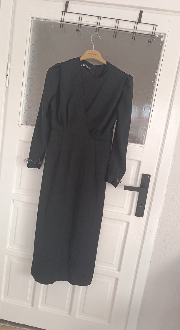 Siyah uzun kollu, V yaka kadın elbise, drapeli detaylara sahip. Klasik ve şık kesimiyle iş ortamına uygundur. Yumuşak ve ipeksi dokulu kumaştan üretilmiştir.