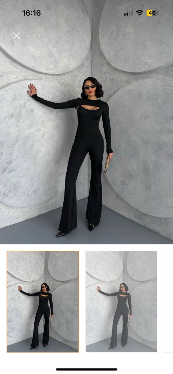 Siyah, uzun kollu ve V yakalı bu dar kesim tulum, ipeksi kumaştan olup cesur ve gotik parti stilleri için uygundur.