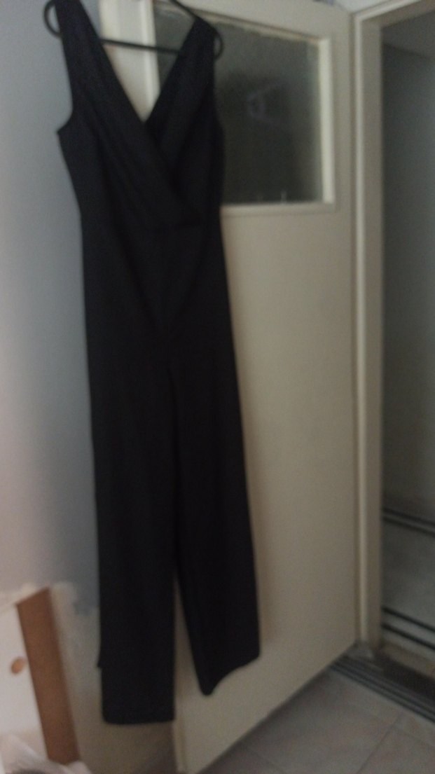 Bu siyah uzun tulum, V yaka ve kolsuz tasarıma sahip olup, drapeli detay içerir. Düzenli kesim ve ipeksi dokusu ile ofis için uygundur, minimalist ve şık gotik tarzda.