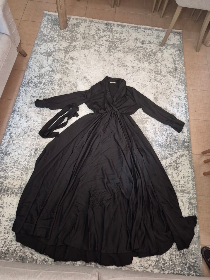 Siyah uzun kollu, V yakalı, dökümlü ve bol kesim elbise. İpeksi kumaştan, gotik ve avangart tarzlara uygun, düğün için ideal.