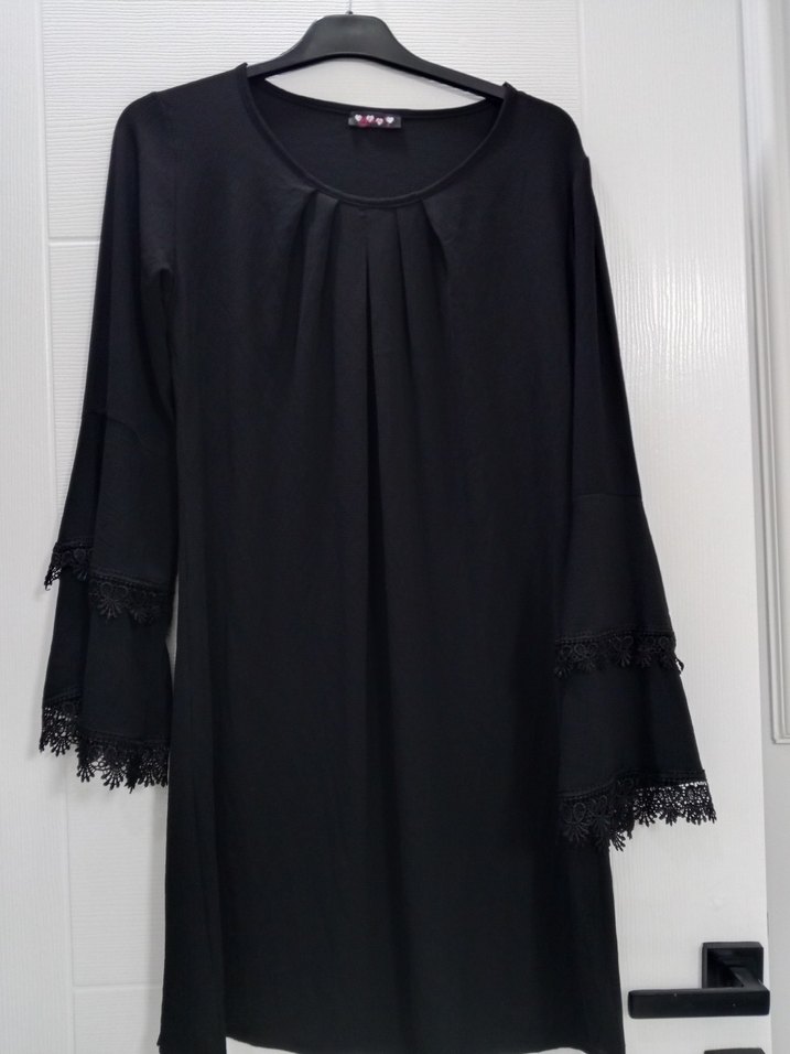 Siyah uzun kollu, V yaka ve kollarda fırfırlı detaylara sahip, bol kesim sentetik kumaştan yapılmış tunik.