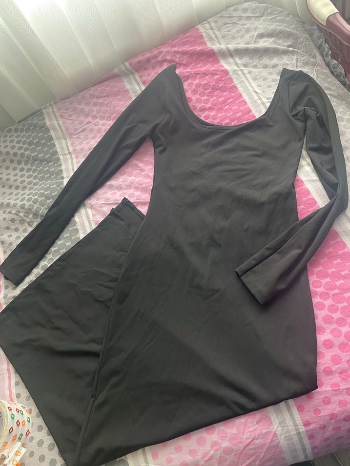 Uzun kollu, V yakalı, drapeli siyah uzun elbise. Sentetik kumaştan üretilmiş, günlük sokak modasına uygun dar kesim.