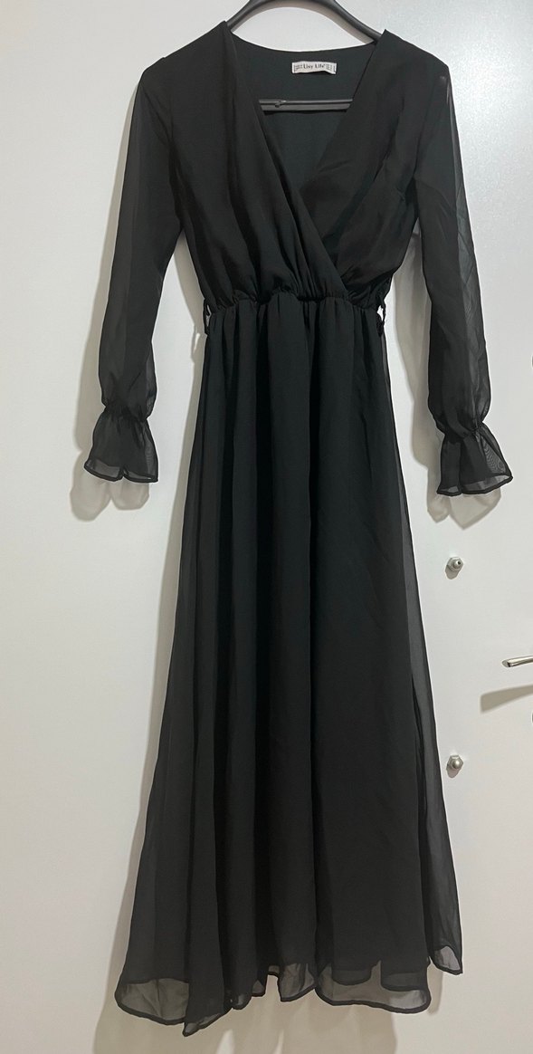 Az kullanıldı. Siyah renkli, uzun kollu ve V yakalı bu uzun elbise, bol kesim ve drapeli detaylara sahiptir. Sentetik kumaştan yapılmıştır ve ofis kullanımı için uygundur.