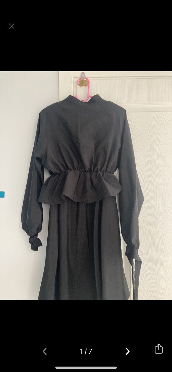 Siyah paraşüt kumaştan, yüksek yakalı, uzun kollu ve bel kısmında volan detaylı bol kesim uzun ikili takım Minimalist tarzda, Ürün 36 38 bedendir ben 45 kg’da giydim 50 kg’a kadar rahat olur Orijinal Henza ürünüdür hiçbir şekilde daraltma kestirme olmamıştır