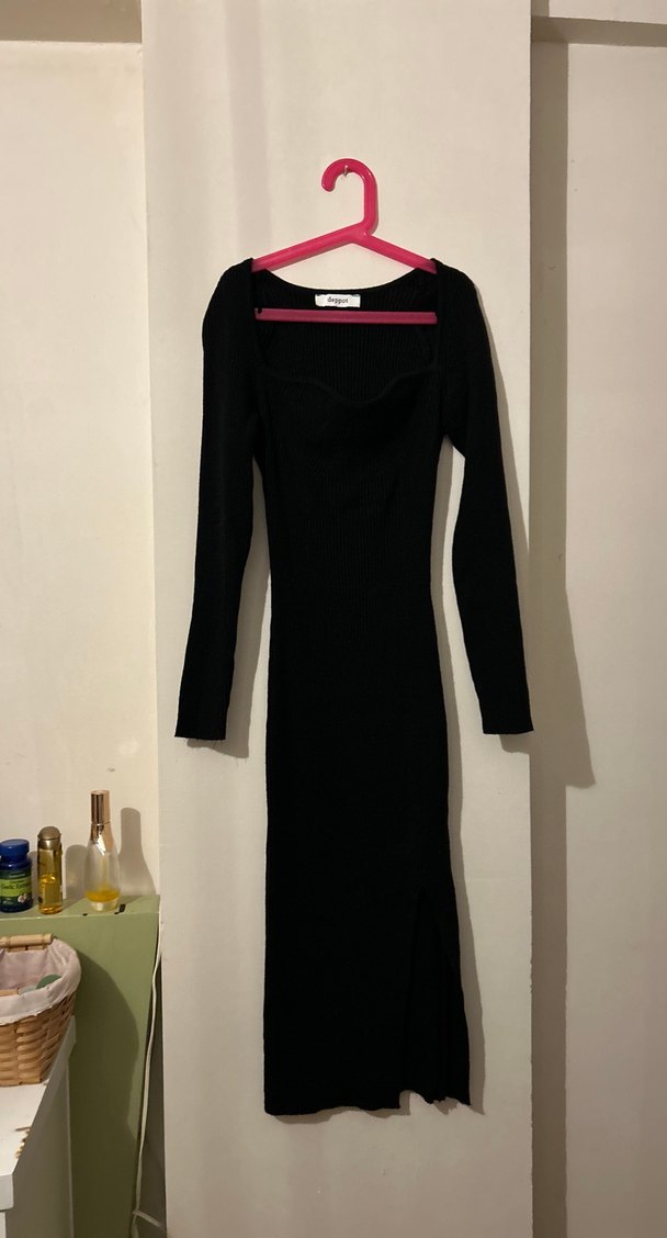 Siyah renkte, uzun kollu ve tek parça vücuda oturan bu elbise, örgü görünümlü sentetik kumaştan üretilmiştir. Minimalist ve gotik tarzlara uygundur, günlük kullanım için idealdir.