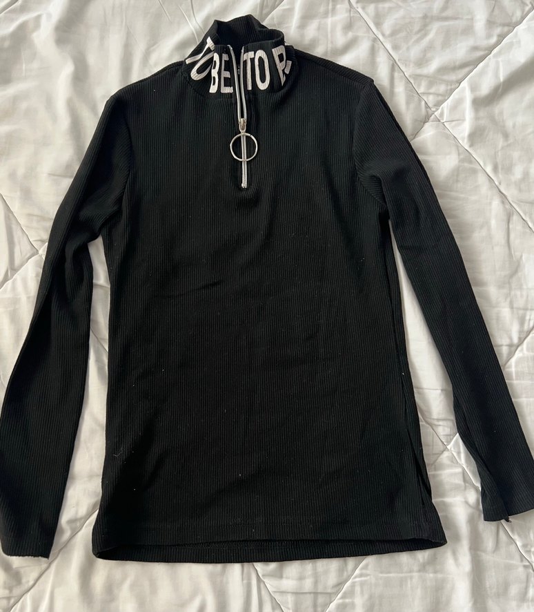 s-m uyumlu. Siyah, uzun kollu ve yüksek yaka fermuarlı, vücuda oturan sweatshirt. Sentetik kumaştan, günlük kullanıma uygun, trend ve rahat bir tasarım.
