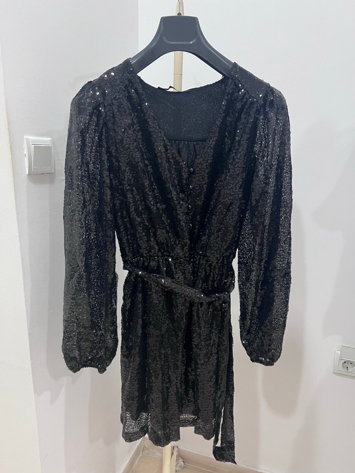Siyah uzun kollu, yılan desenli gece elbisesi, kemerli ve bol kesim. V yaka ve göz alıcı gotik tarzıyla romantik akşamlar için ideal.