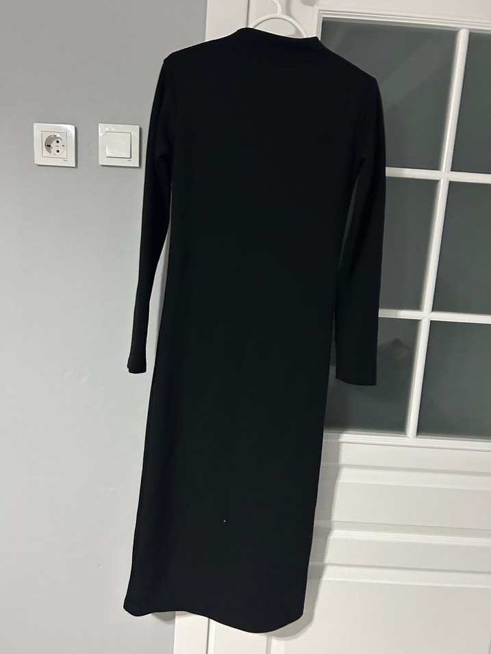 Siyah uzun elbise, yüksek yakalı ve uzun kollu, vücuda oturan kesimlidir. Yırtmaç detayı vardır ve sıcak, yumuşak kumaştan üretilmiştir.