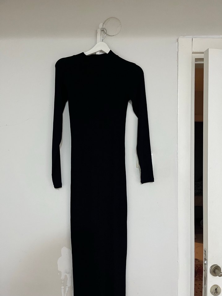 Yüksek yakalı, uzun kollu ve vücuda oturan bu uzun elbise, pürüzsüz sentetik kumaştan üretilmiştir. Minimalist siyah tasarımı ile günlük kullanıma uygun, goth tarzında şık bir görünüme sahiptir.