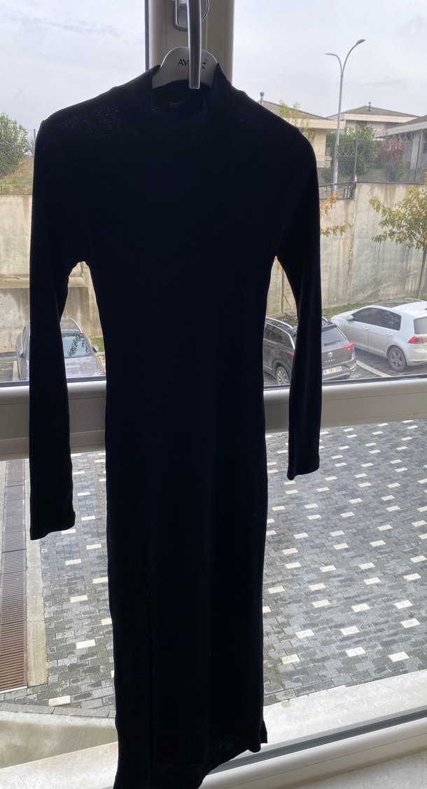 Yüksek yakalı, uzun kollu, drapeli siyah uzun elbise, yumuşak ve sıcak kumaştan, sokak modasına uygun.