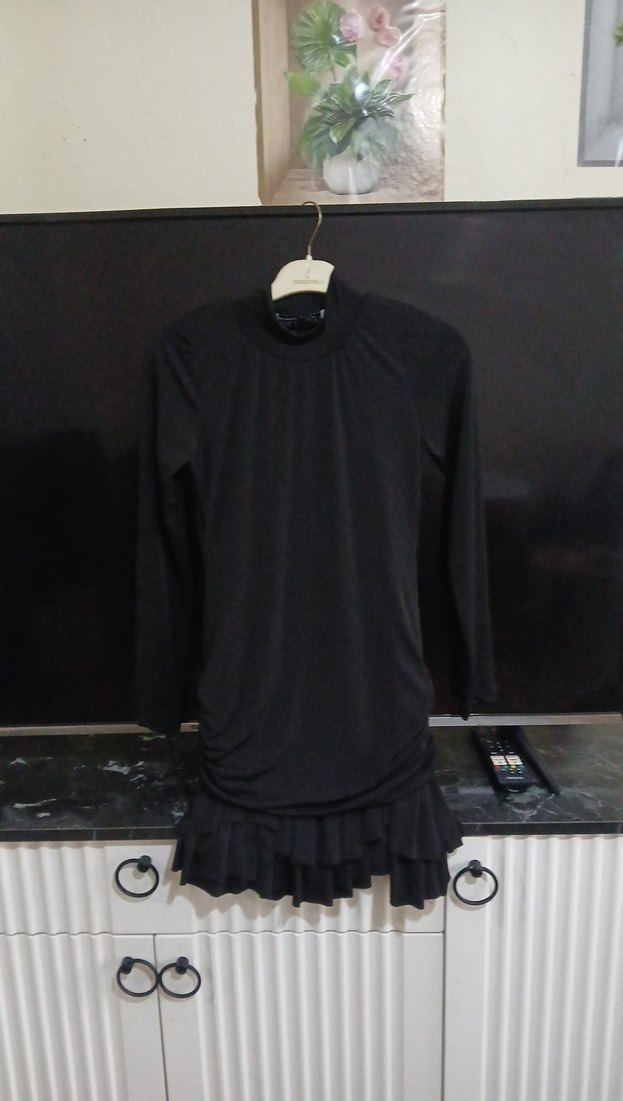 Siyah, yüksek yakalı ve uzun kollu, vücuda oturan hamile tunik. Midi boyda, etek kısmında fırfır detaylarıyla gotik tarzda tasarlanmıştır. Günlük kullanıma uygun, desensiz ve koyu renktedir.