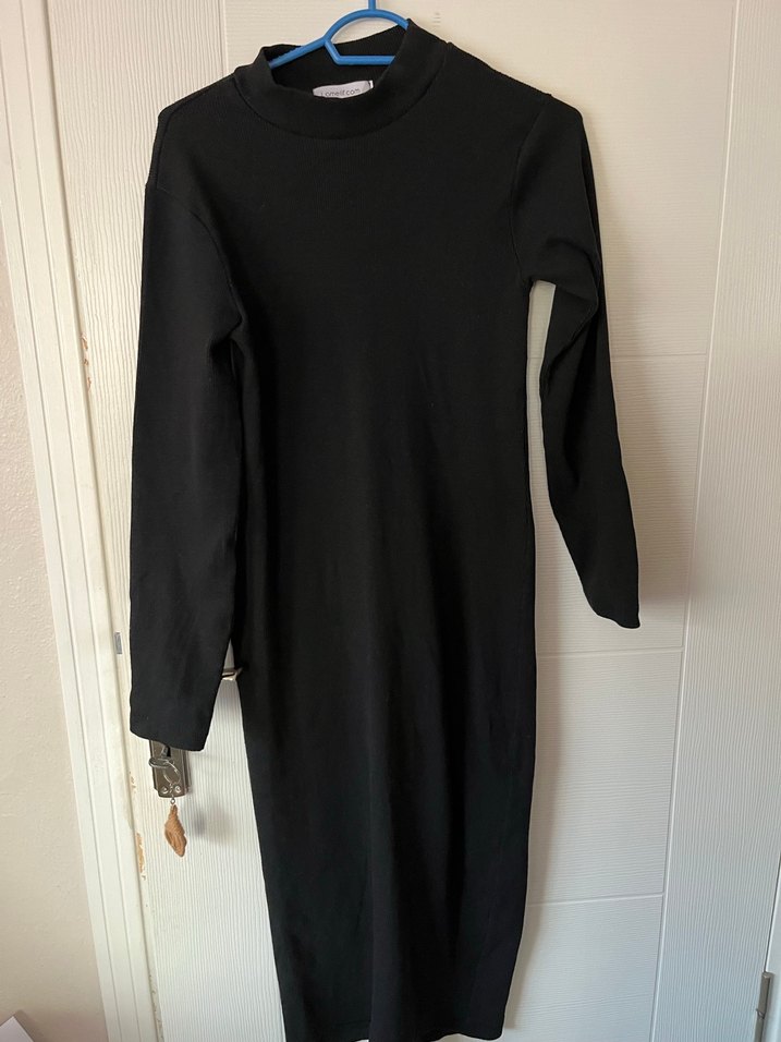 Düz siyah, uzun kollu ve yüksek yakalı bu dar kesim elbise, pürüzsüz sentetik kumaştan yapılmıştır. Minimalist tasarımıyla günlük şıklık sağlar.