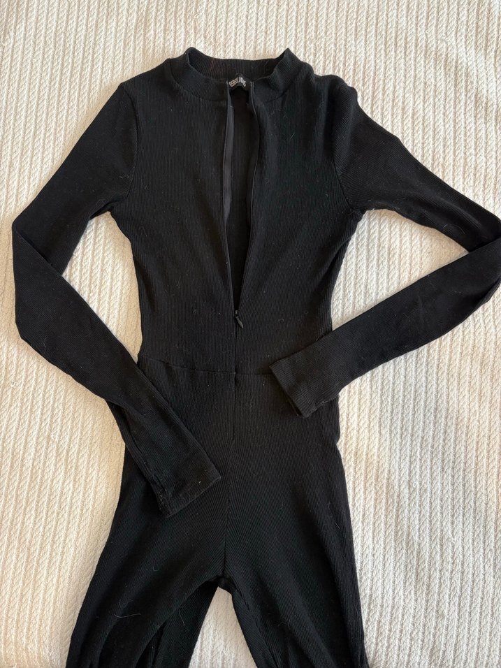 Siyah renkte, uzun kollu ve yüksek yakalı kadın tulumu. Sentetik kumaştan üretilmiş, önünde fermuar bulunur. Minimalist goth tarzda günlük kullanıma uygun.