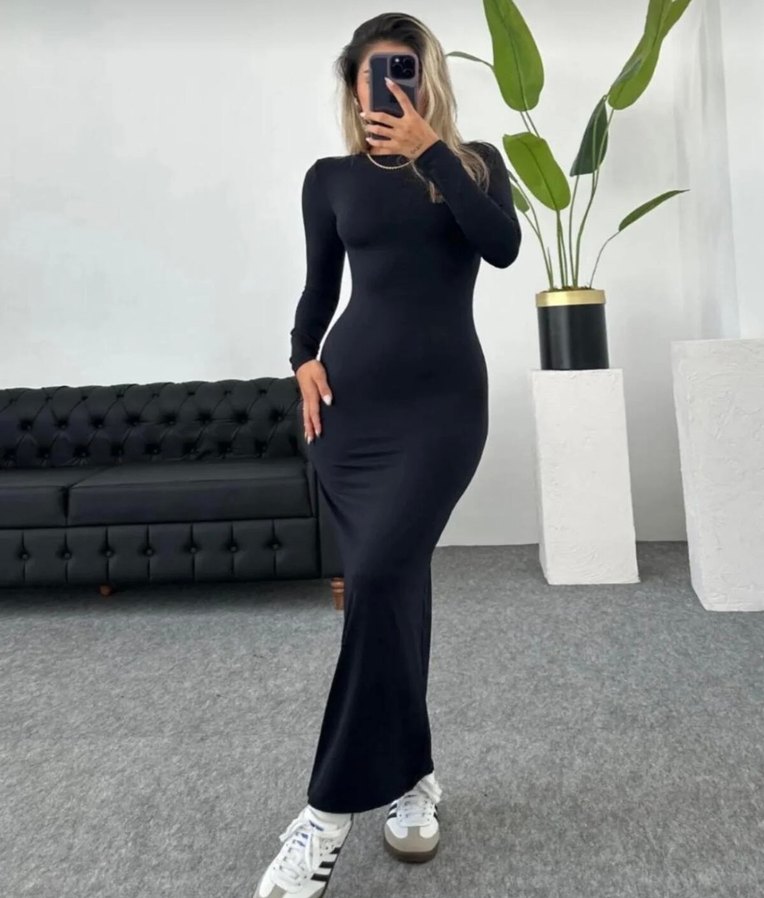 Siyah, uzun kollu ve yüksek yakalı bu dar kesim elbise, yumuşak sentetik kumaştan üretilmiştir. Günlük kullanım için rahat ve şık bir seçenektir.