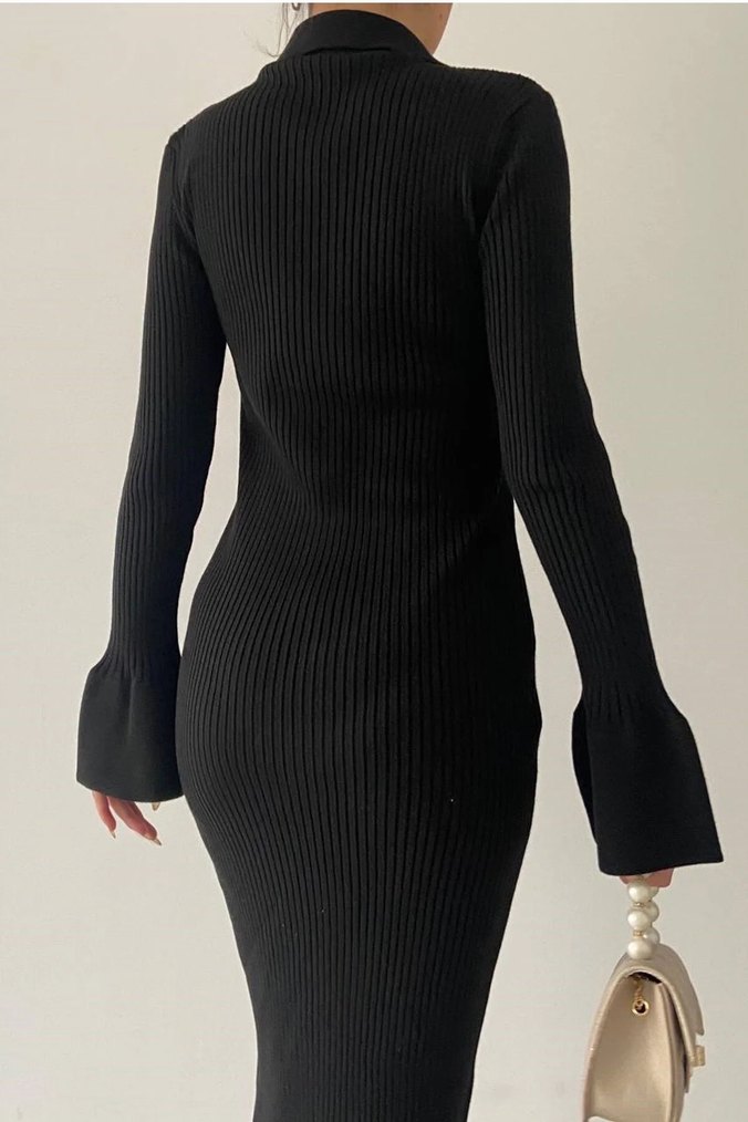 Triko kumaştan, uzun kollu ve yüksek yakalı, vücuda oturan siyah triko elbise. Cesur goth tarzıyla ofis için uygundur.
