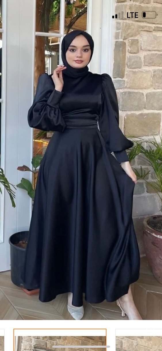 Siyah uzun elbise, yüksek yaka ve uzun kollara sahip. Dökümlü ve ipeksi kumaşı zarifçe akar. Düzenli kesim, gotik tarzda, düğünler için uygun.
