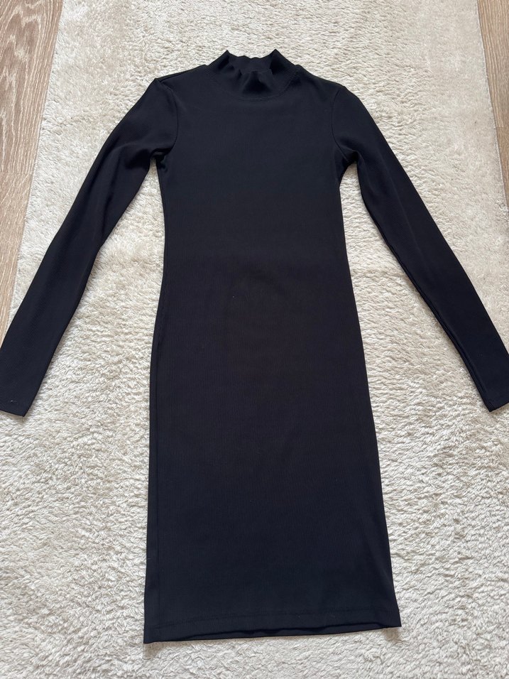 Uzun kollu, yüksek yakalı dar kesim siyah elbise, rahat sentetik kumaştan. Minimalist ve sade tasarımıyla günlük kullanıma uygun.