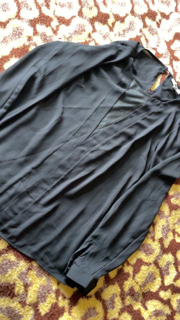 Bu siyah kadın bluz, uzun kollu, yüksek yakalı ve ipeksi dokuda drapeli, bol kesimdir. Ofis için gotik ve avant-garde tarzına uygundur.