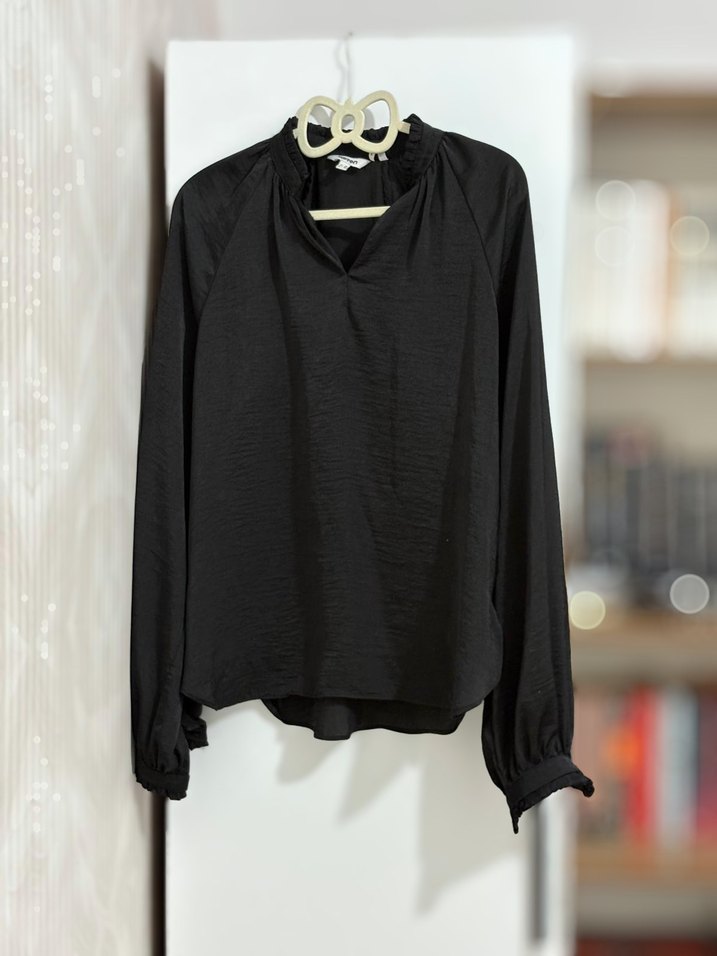 Siyah, uzun kollu ve yüksek yakalı kadın bluz. Yumuşak keten kumaştan, salaş ve midi boyda, desen içermeyen minimalist tasarım. Günlük rahat ve şık kullanım için uygun.