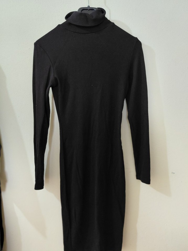 Siyah uzun kollu, yüksek yakalı ve vücuda oturan kesime sahip, düz ve şık kadın elbisesi. Ofis ve günlük kullanıma uygundur.
