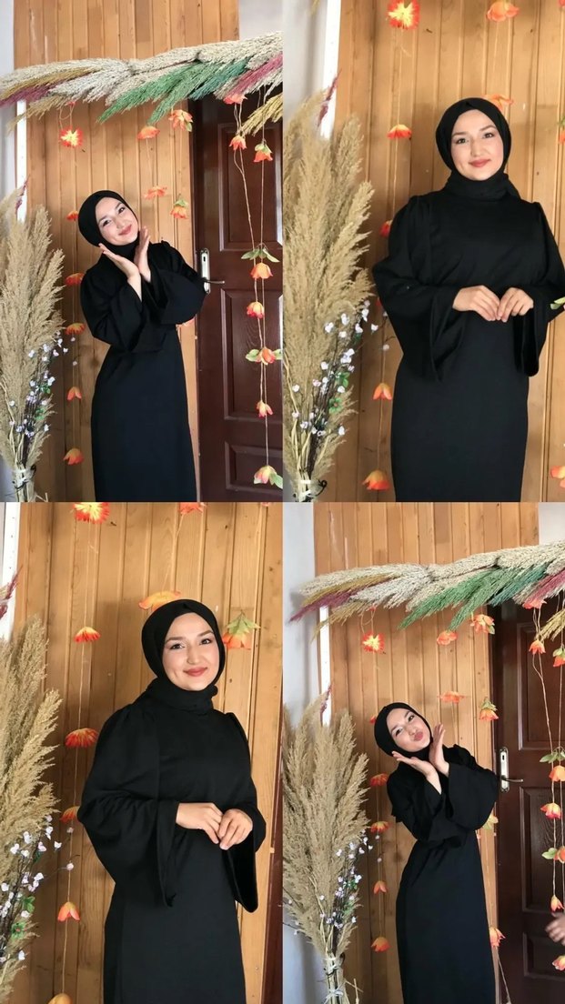 Bu siyah uzun elbise, yüksek yakalı ve uzun kolludur. İpeksi kumaştan, drapeli ve etnik desenlidir. Günlük kullanıma uygundur.