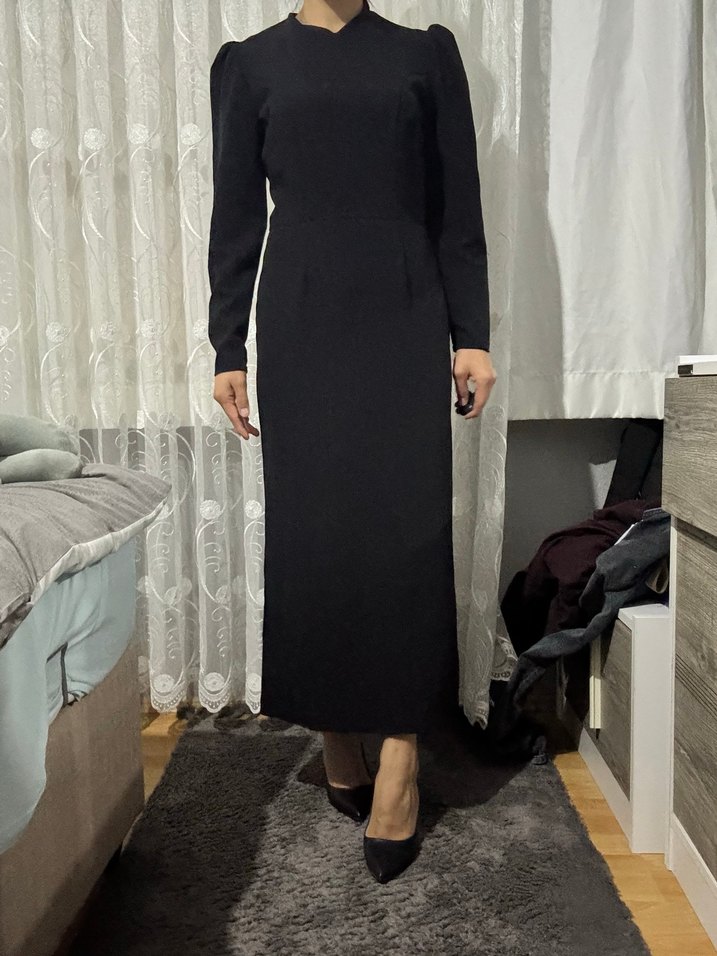 Siyah uzun kollu, yüksek yakalı, düz renk tesettür elbise hiçbir sorunu yok 1 kere kullanıldı ☺️