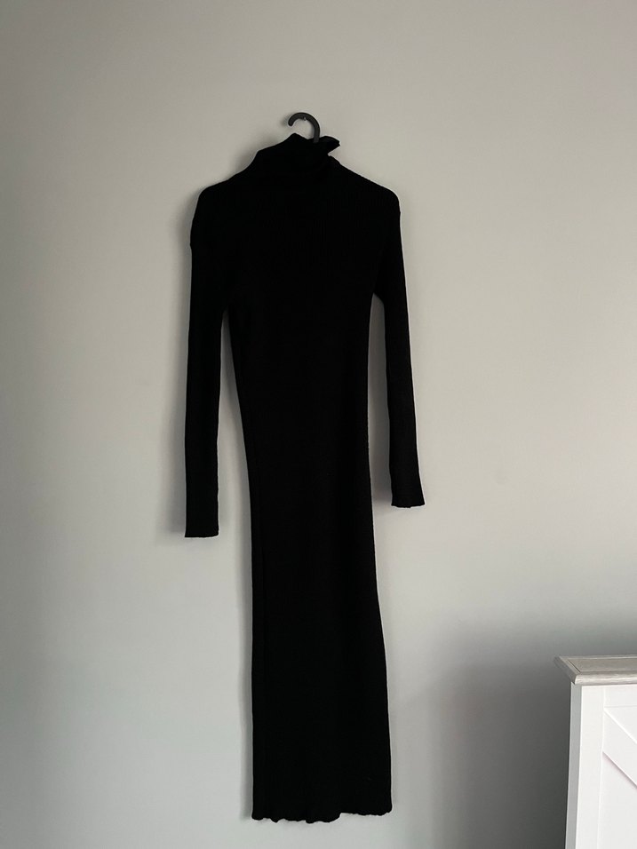 Yumuşak kumaştan, yüksek yakalı ve uzun kollu siyah uzun elbise. Günlük kullanıma uygun, drapeli ve minimalist gotik tarzda.