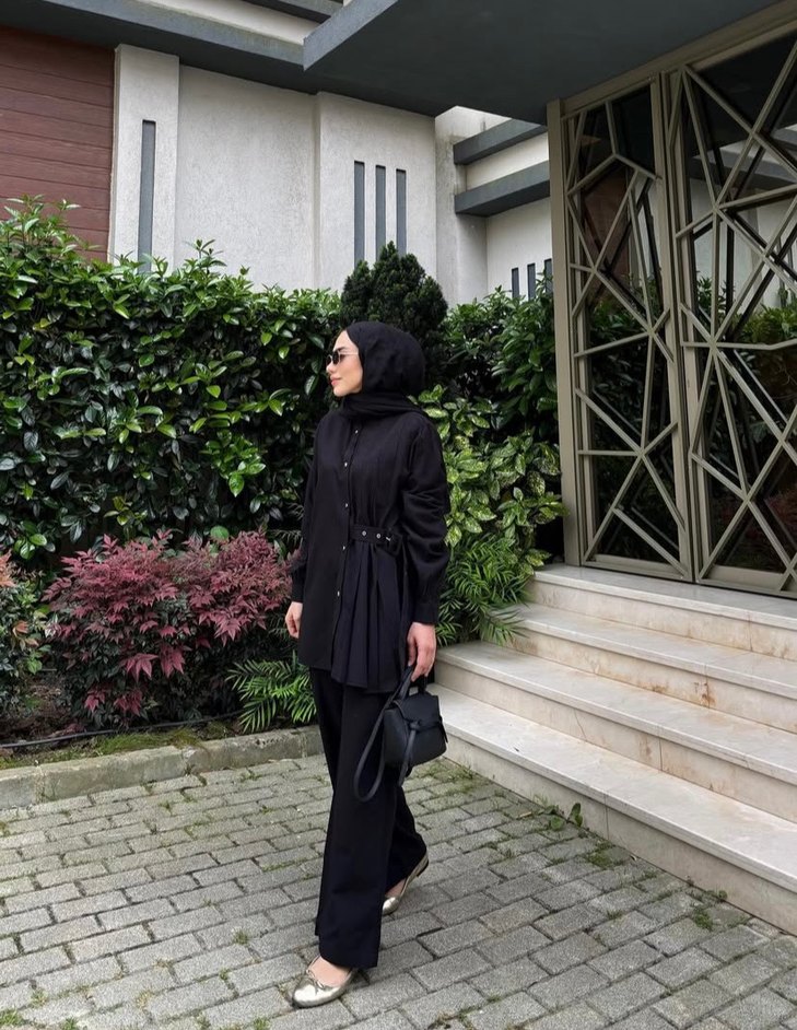 Siyah renkte, yüksek yakalı ve uzun kollu kadın takımıdır. Düz desensiz, rahat kesimli ve sentetik kumaştan yapılmıştır. Günlük kullanıma uygundur.