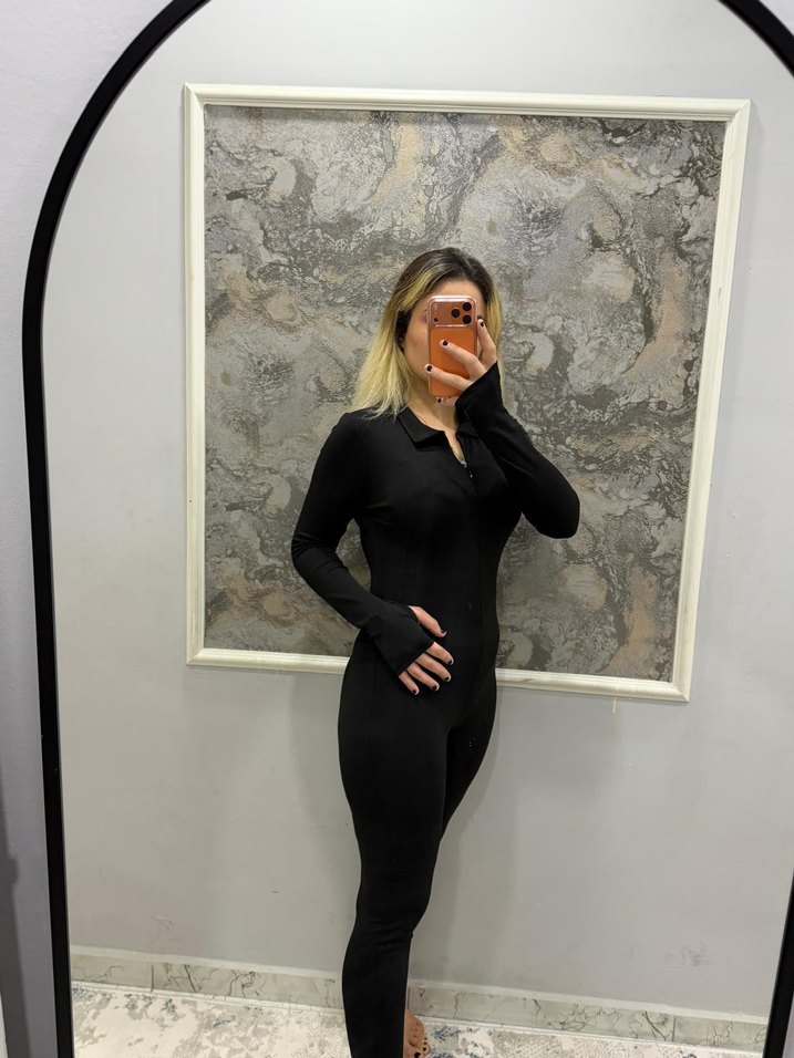 Siyah, yüksek yakalı ve uzun kollu bu dar kesim tulum, pürüzsüz sentetik kumaştan üretilmiştir. Düz tasarımıyla günlük kullanıma uygun, cesur athleisure tarzını yansıtır.