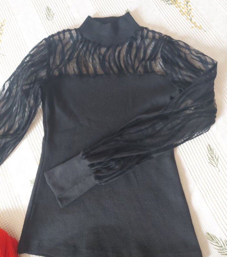 Siyah, yüksek yakalı ve uzun kollu, triko dokulu, desenli tül kollara sahip dar kesim bluz. Günlük kullanıma uygundur.