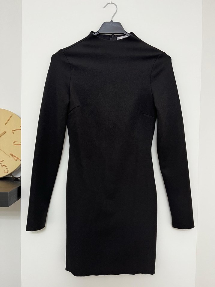 Siyah, uzun kollu, yüksek yakalı ve mini boyda triko elbise. Minimalist ve desensiz tasarımıyla ofis için uygun, yumuşak sentetik kumaştan üretilmiştir. Ofiste giymek için almıştım kilo aldığım için giyemedim