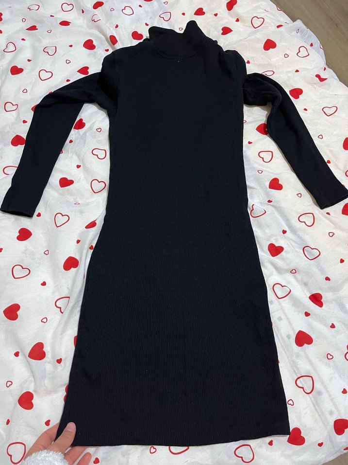 Siyah, uzun kollu, yüksek yakalı ve vücuda oturan uzun elbise. Sentetik kumaştan, etek kısmında yırtmaç bulunur. Romantik akşamlar için uygundur.