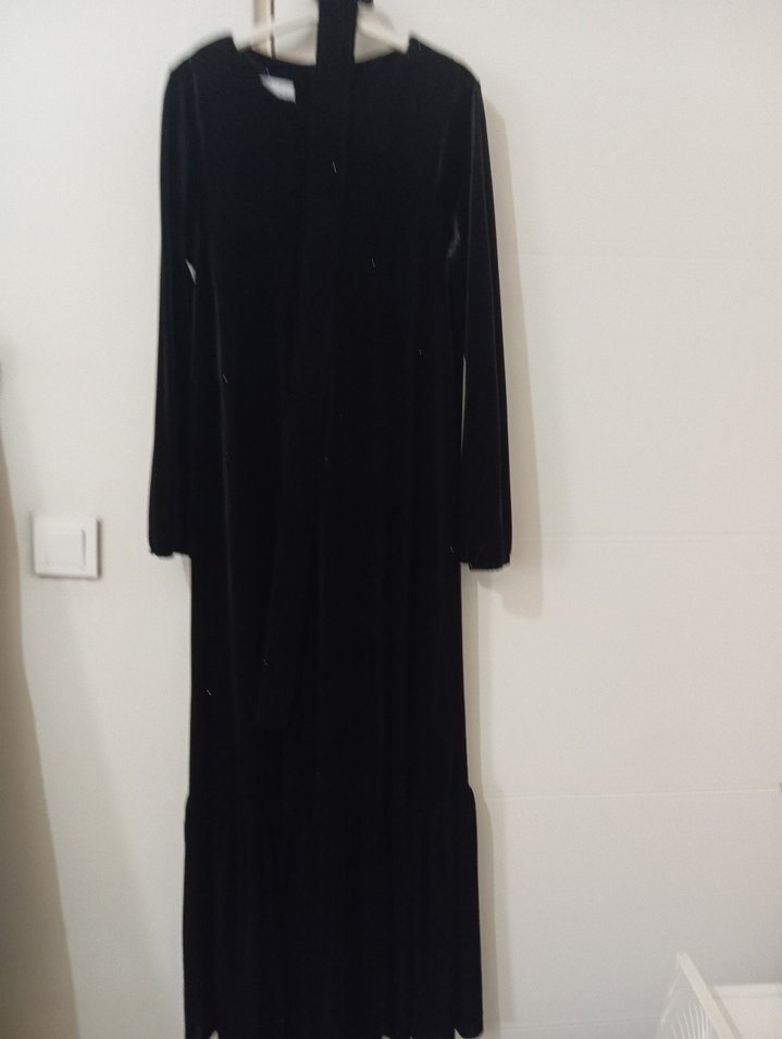 Siyah uzun kollu, yüksek yakalı ve rahat kesimli bu elbise, yumuşak ve sıcak kumaştan üretilmiştir. Günlük kullanım için uygundur.