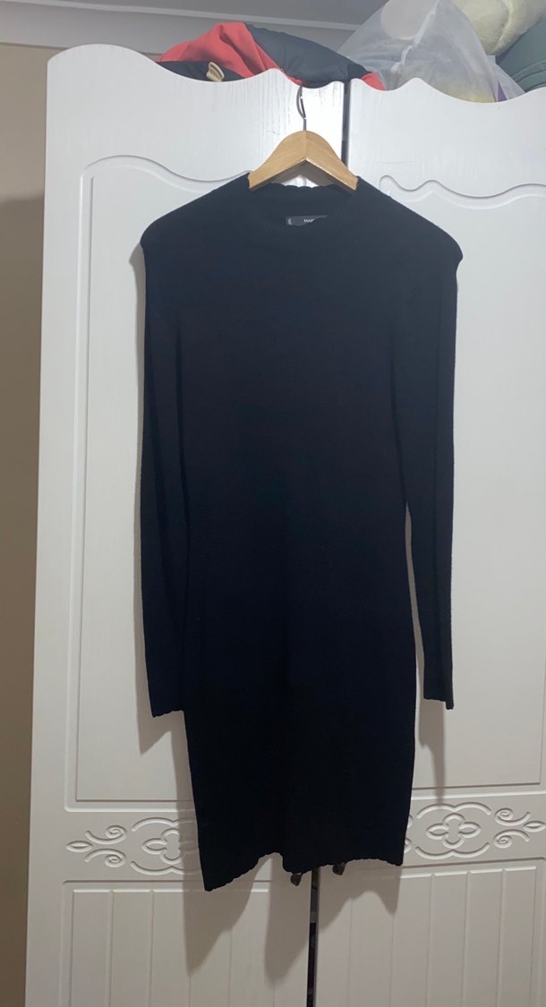 Siyah, uzun kollu ve yüksek yakalı, ince kesim uzun elbise. Yumuşak ve sıcak kumaştan, minimalist goth tarzını yansıtır, ofis için uygun.