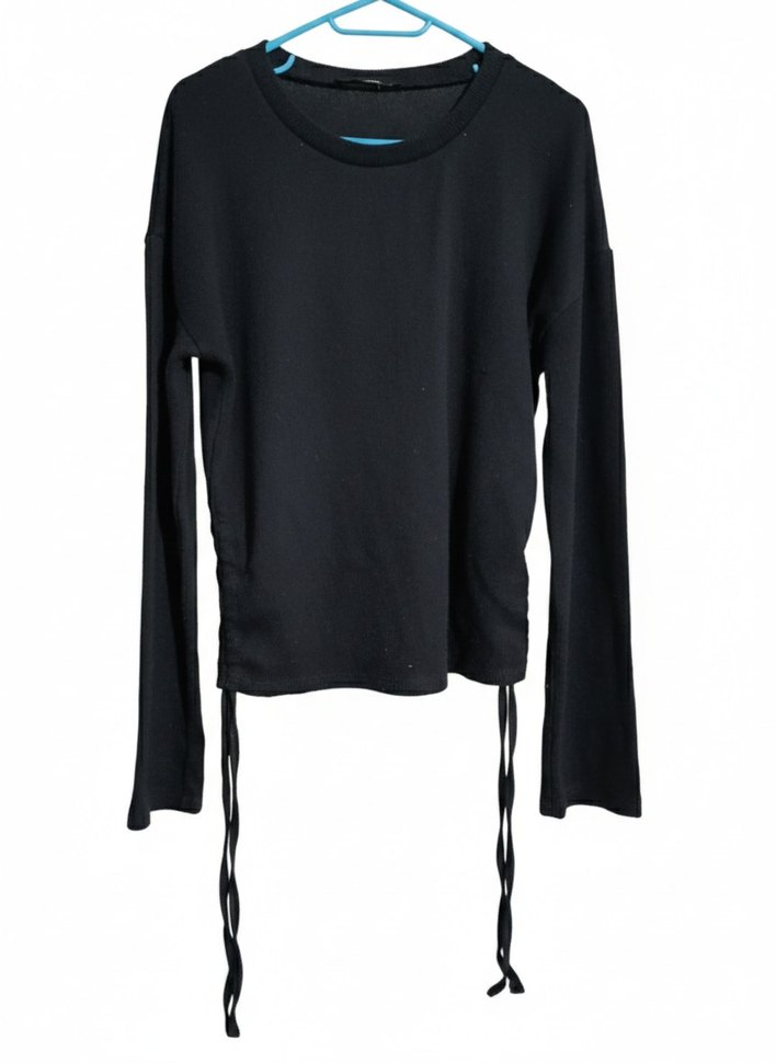 Siyah, uzun kollu, yuvarlak yaka ve salaş kesime sahip sweatshirt. Yumuşak sentetik kumaştan, normal midi boyda ve bağcık detaylı, zahmetsiz şıklık sunar. uzun kollu siyah olanın bedeni XS, crop olan bedeni 26