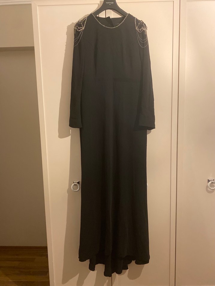 Bu siyah uzun elbise, uzun kollu içi astarlı arkası boydan Düğmeli hafif arka kuyruklu kumaşı tok çok şık bir elbise