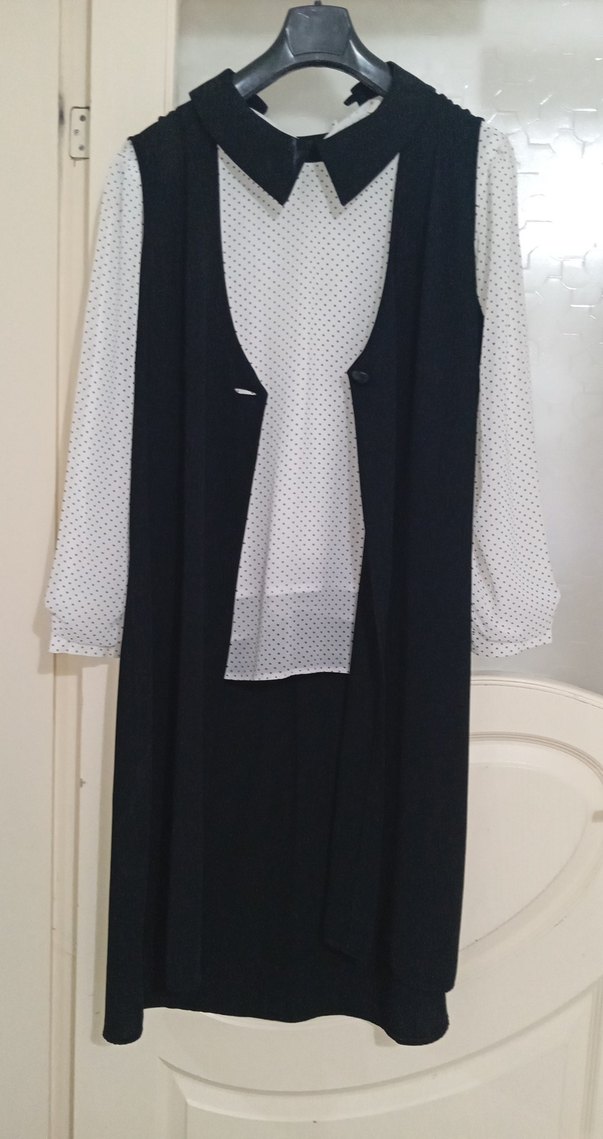 Uzun siyah kolsuz ceket, drapeli tasarıma sahip ve beyaz puantiyeli gömlekle kombinlenmiş. Ceket, kesik yaka ve regular fit ile sentetik kumaştan üretilmiştir. Ofis için uygun, gotik ve avangart tarzda her yere uygun ikili takım ceketli çok güzel yakası çok güzel uygun fiyata alırsanız bana yazıp IBAN atarsanız daha uyguna verebilirim..