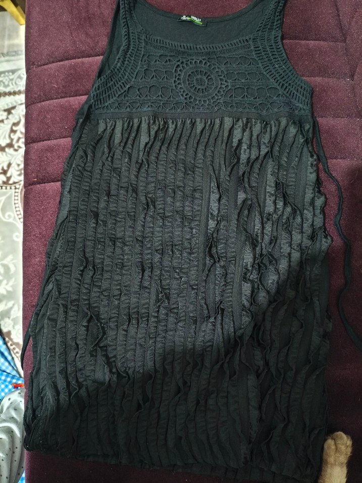 Siyah uzun örme elbise, yüksek yakalı ve fırfırlı detaylara sahip. Gotik ve bohem tarzı bir arada sunar. Kolsuz ve sentetik kumaştan, günlük kullanıma uygun.