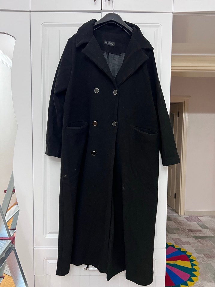 Bir adet düğmesi yok 44/46 beden uyumlu…Siyah uzun kaban, çift sıra düğmeli ön ve iki yan cep detaylarına sahiptir. Yaka ve rahat kesimiyle şık bir görünüm sunar.