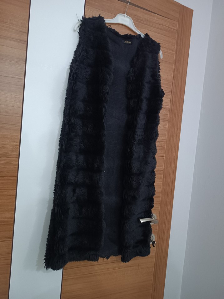 Siyah uzun ve kürk detaylı, v yaka ve kolsuz tasarıma sahip, yumuşak sentetik kumaştan üretilmiş kadın yeleği. Gotik ve şık tarz için uygundur.
