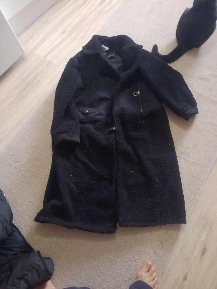 Siyah uzun kesim, bol fitli hamile kaban. Kürk detayları ve kesik yaka ile günlük kullanıma uygun, rahat ve sıcak kumaştan yapılmıştır.
